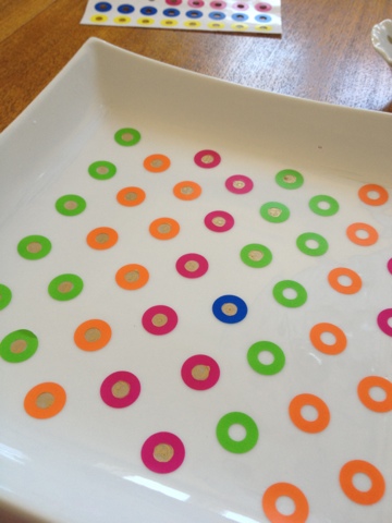 After the marker has dried, carefully remove the stickers from the dishes. I used a fine needles to lift them them, then peeled them away. I had a couple of small bleeds but was able to scratch them off with the end of the needle.